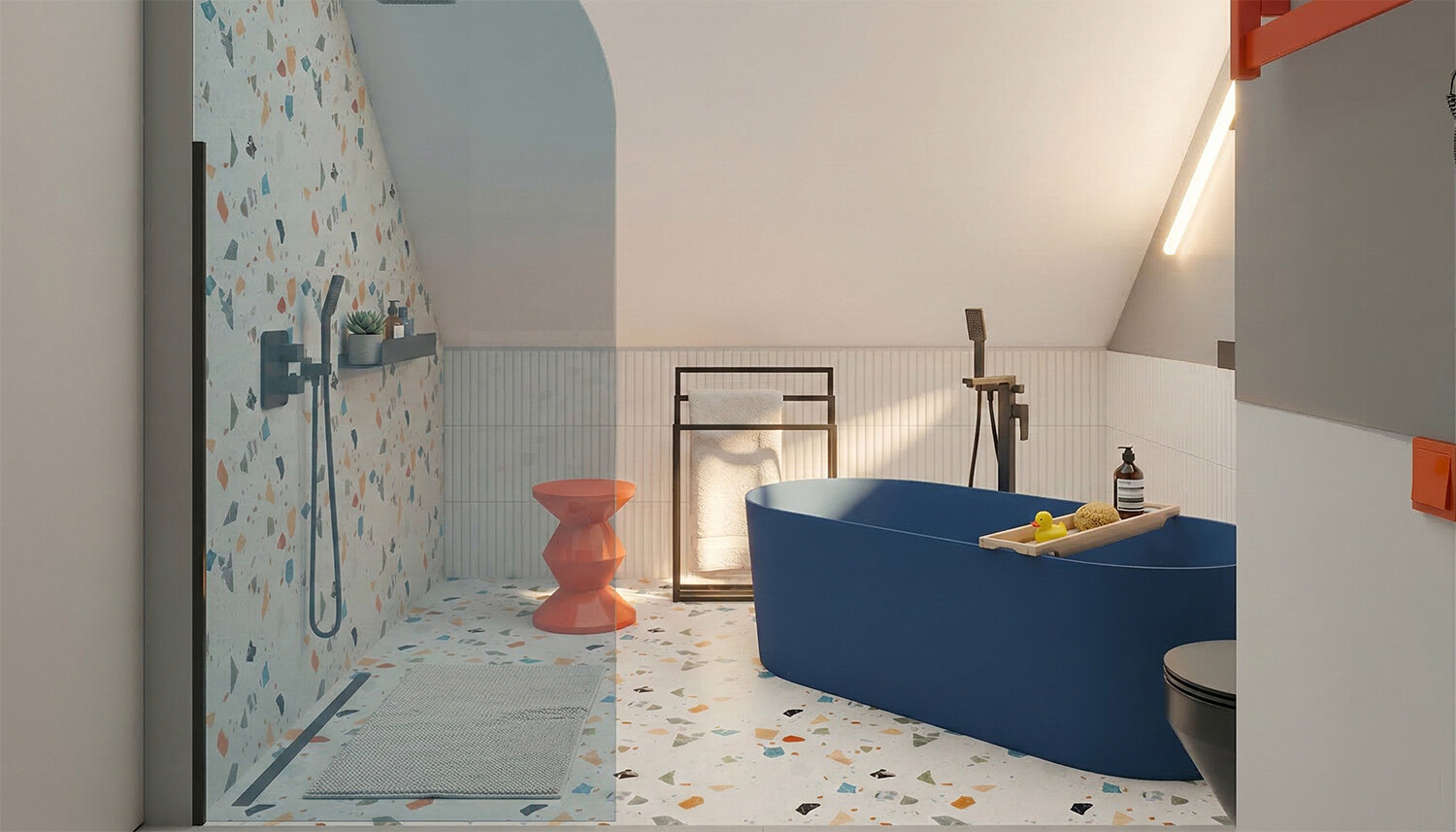 Oświetlenie łączy naturalne światło ze świetlików z miękkim, rozproszonym światłem punktowym, co sprawia, że poranne i wieczorne rytuały kąpielowe są przyjemne i bezstresowe.