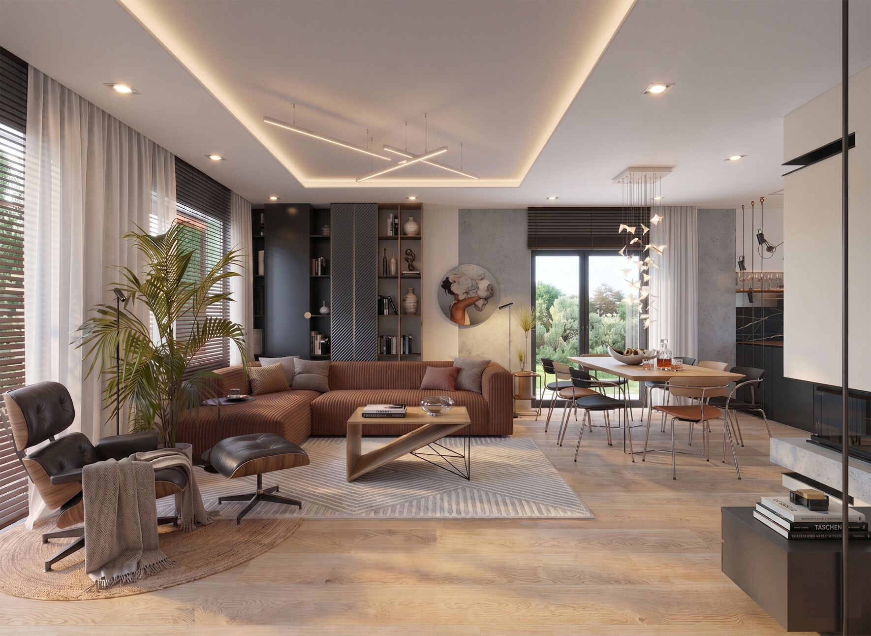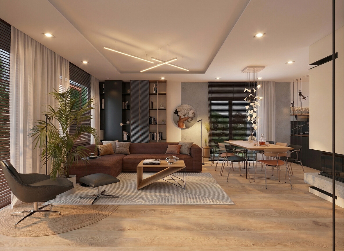 Projekt wnętrz domu jednorodzinnego w Bydgoszczy opiera się na konsekwentnym połączeniu materiałów, kolorów i faktur. Beton, drewno oraz ciepłe brązy budują przytulną atmosferę, natomiast nowoczesne formy mebli i minimalistyczne detale podkreślają współczesny charakter przestrzeni. Efektem jest harmonijna i funkcjonalna przestrzeń mieszkalna, która łączy nowoczesny design z komfortem codziennego życia.